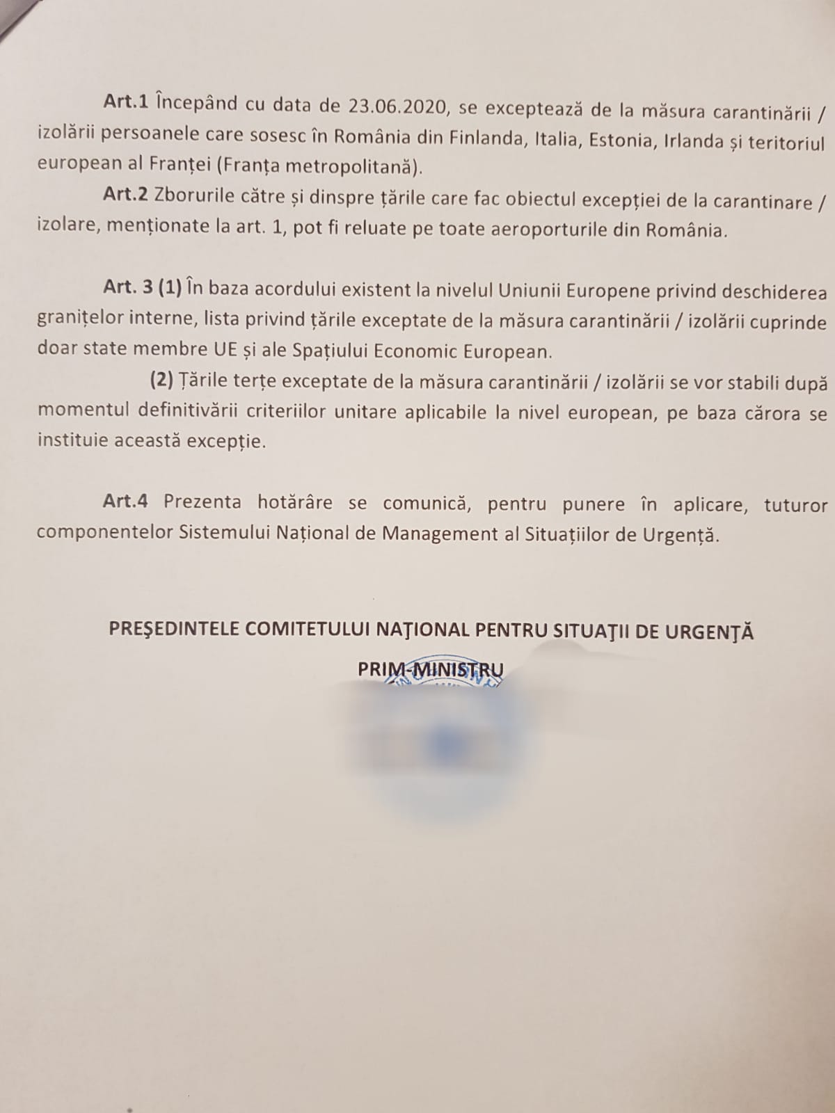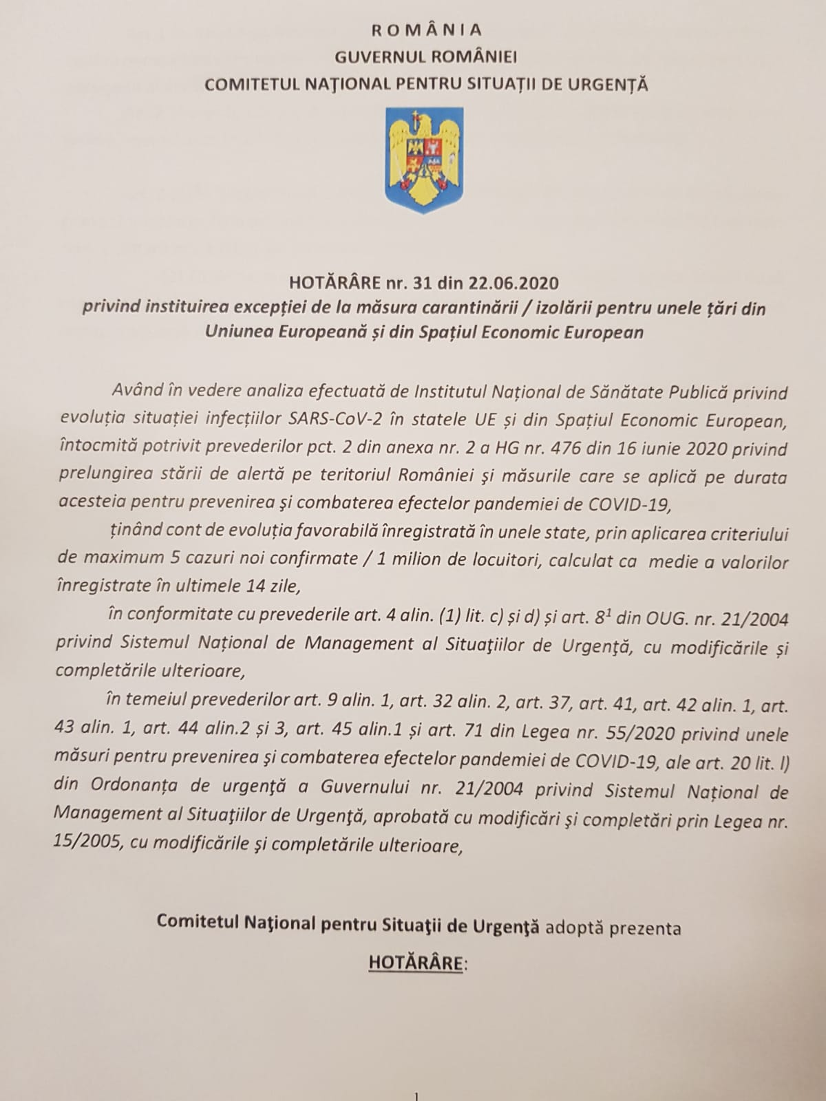 Premierul României, Ludovic Orban, a convocat luni 22 iunie a.c. Comitetul Național pentru Situații de Urgență care a adoptat hotărârea nr. 31 prin care a fost actualizată lista statelor exceptate de la aplicarea măsurilor de carantină/izolare (zonă verde). Excepția se aplică persoanelor asimptomatice care sosesc în România din statele aflate pe listă.
